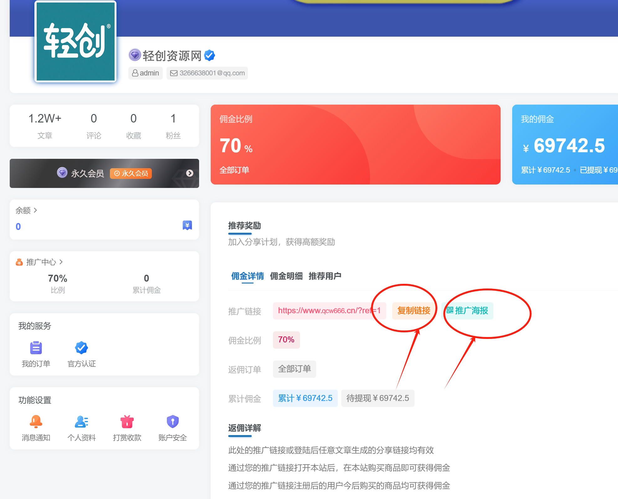 ☁ 在用户中心-推广中心-复制链接或推广海报